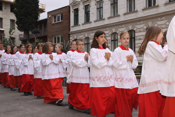 Die Ministrantenschar zieht über den St.-Bartholomäus-Platz zur Kirche