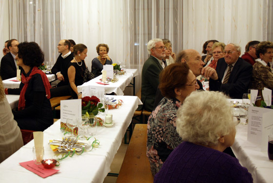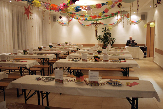geschmückte Saal mit den gedeckten Tischen. Vorne, in