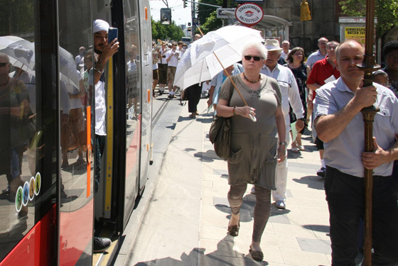 Becher und Flaschen mit Wasser: Unterwegs werden damit Gläubige mit stärkendem Nass