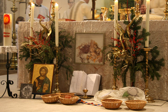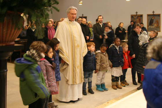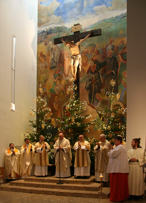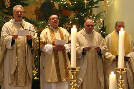 neuen Pfarrverbands an der Stirnwand der weihnachtlich geschmückten Dornbacher
